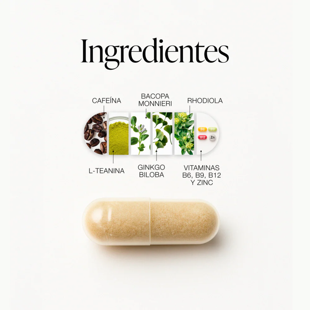 Su fórmula está diseñada para potenciar un rendimiento cognitivo sostenible, brindándote las herramientas necesarias para afrontar los desafíos del presente y del futuro con confianza.